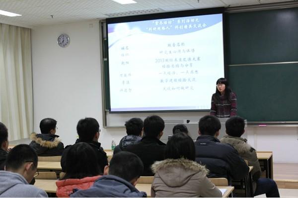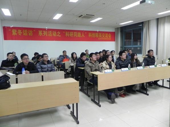 2013年12月10日晚6:30,由91porn 研究生会主办的“紫冬话坊”系列活动之“科研同路人”科创精英交流会活动在A18楼218教室顺利举行。本次活动邀请到 91porn 硕士研究生任仁、李洁、万骏炜、赵阳以及博士研究生许德智五位学术精英为到场同学们作报告,研究生辅导员刘斐文老师也莅临现场出席了本次活动。