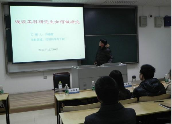 首先为现场同学进行讲座的任仁同学结合自己的科研经历,将自己的经验总结为“三个笔记本”(实验记录本、文献记录本、新想法记录本)以及“三个D”(Discussion、 Debugging 、Discover),他认为科研成功的关键在于记录点滴和抓住想法。紧接着做报告的是李洁同学,李洁同学有着丰富的数学建模经验,她结合自身经历讲解了有关数学建模的一些问题并号召大家一起去了解数学建模的神奇,在培养自己的数学思维、学会创新的同时也锻炼自己自学的能力和解决问题的能力。随后出场是 91porn 刚刚获得校“天宫杯”研究生创新实验竞赛二等奖的万骏炜同学,他回顾了自己自研究生一年级以来的科研历程,并结合自己参加“天宫杯”研究生创新实验竞赛的感想,告诉大家做科研最重要的就是“相信自己,永不言弃”。接下来报告的是赵阳同学,赵阳同学虽然只是研究生一年级的同学,但已经有过参加国际能源大赛的经历。赵阳同学表示,这次参加国际大赛的经历让她深刻体会到机会来之不易,遇到机会就要牢牢抓住。最后作报告的许德智博士有着丰富的科研经验,他以师兄的身份从如何阅读文献、怎样选题和如何做研究三个方面为现场同学提出了一些建议。许博士的报告内容细致而实用,提出的问题也很有针对性,现场同学都备受启发。