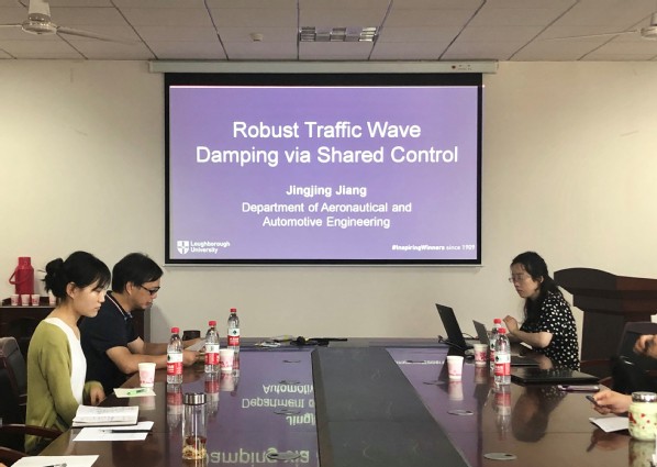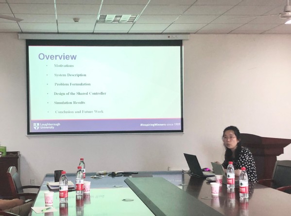 随后,Jingjing Jiang博士向在场师生分享了她在共享控制方面的最新研究成果。她首先以交通流为背景,介绍了共享控制在现实交通环境下的实际应用与研究意义。接着,她引入了多智能体车辆跟随模型,根据该模型设计了共享控制律,同时对共享控制器的鲁棒性进行了分析。接着,Jingjing Jiang博士向师生们演示了所设计的共享控制律在车辆跟随模型中的仿真效果,并进一步展示了她的研究成果。最后,Jingjing Jiang博士对共享控制的研究前景提出了展望。