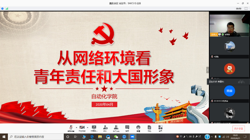 为贯彻中央《关于加强党的领导、为打赢疫情防控阻击战提供坚强政治保证的通知》和《新时代爱国主义教育实施纲要》精神,发挥学生党员先锋模范作用,认真学习新冠肺炎疫情防控“大课”,涵育新时代爱国主义精神、坚定爱国力行使命责任,4月21日,91porn 本科2018、2019级联合党支部开展了一次线上“微党课”,从网络环境看青年责任和大国形象。