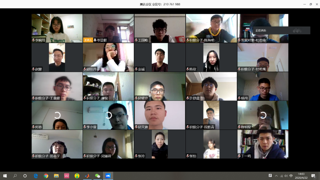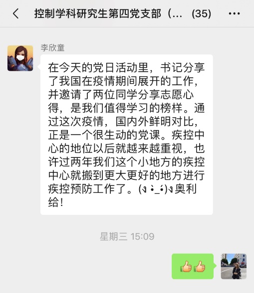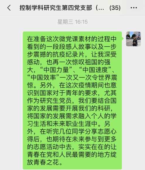 控制学科研究生第四党支部开展了一场以“战‘疫’下的中国,奋斗中的你我”为主题的线上党日活动,支部党员、发展对象、积极分子共计41人参加了本次活动。该党支部由学院教职工张玲老师担任支部书记,本次活动参与人员均为导航研究中心研究生。