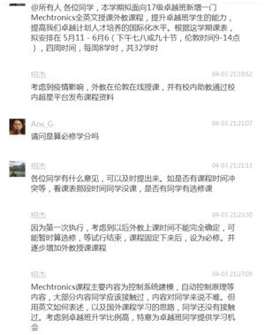 之后的时间,我们与外教、学生、助教老师等组成了微信群,在群内及时讨论课程相关的安排。考虑到上课方便与网络稳定性等因素,外教与学生对多款线上教学软件进行对比,最终确定Microsoft Teams作为上课的软件平台。并在正式上课前完成了试课,对采用软件进行网络授课进行了测试,效果良好。