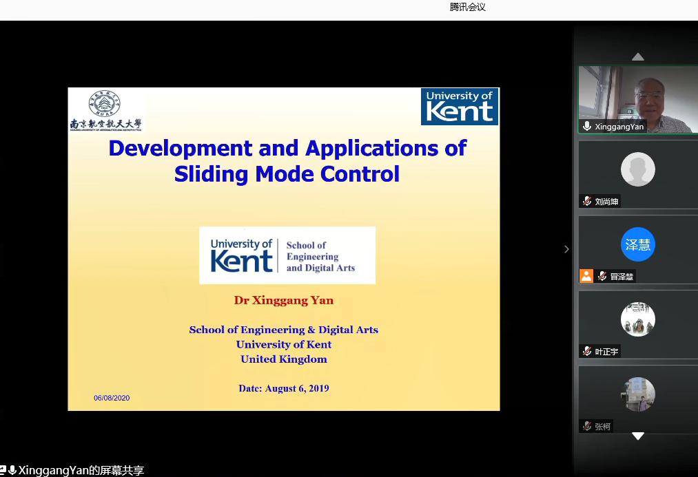 8月6日下午,英国肯特大学工程技术与数码学院严星刚副教授应我校国际合作处和自动化学院的邀请,通过腾讯会议作了题为“Development and Applications of Sliding Mode Control”的线上学术报告,报告由副校长姜斌教授主持,91porn 冒泽慧、张柯、张绍杰、马亚杰等师生在线参加会议。参会师生对严星刚副教授的交流分享表示热烈欢迎。