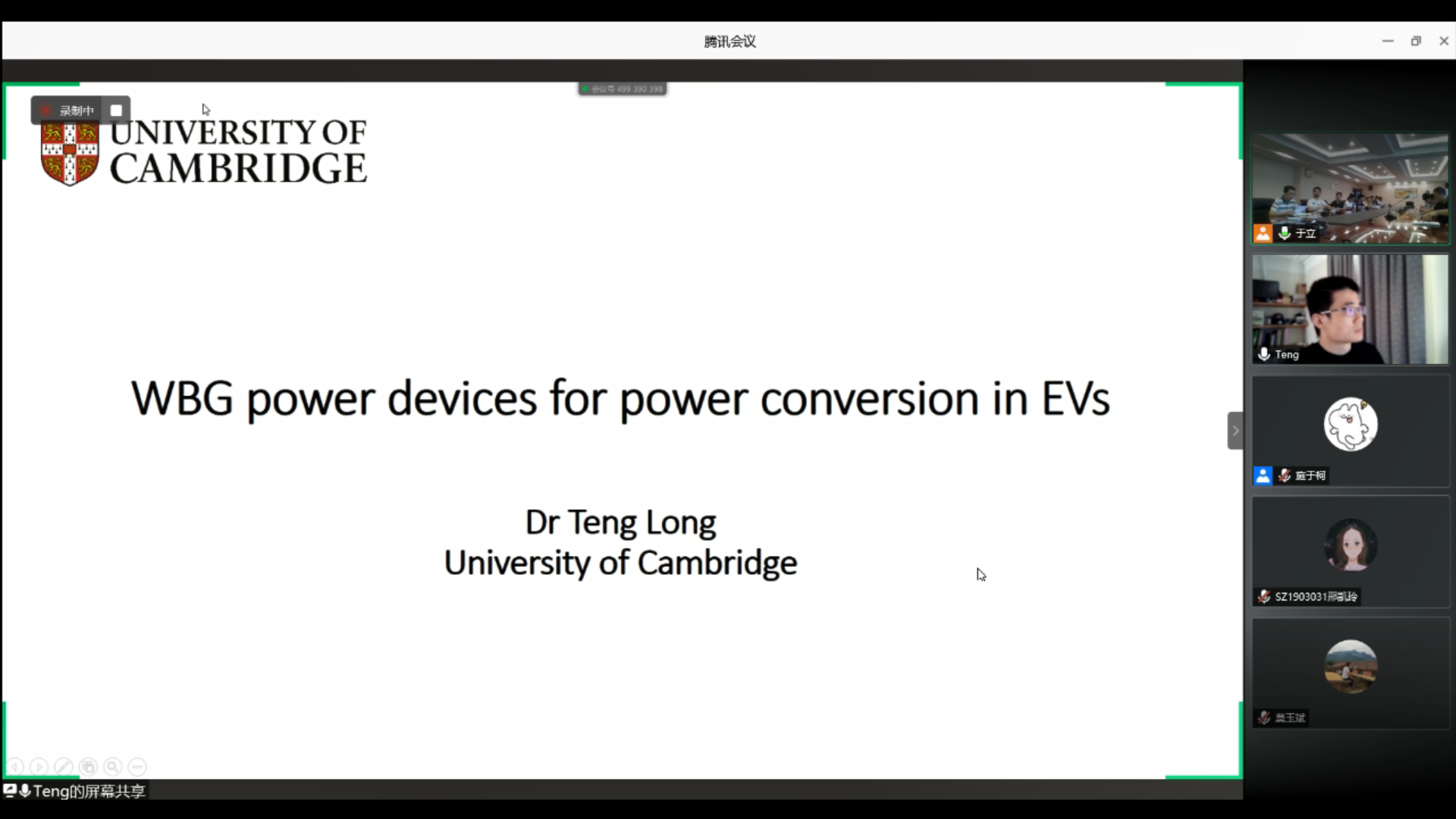 911日下午,剑桥大学应用电力电子实验室主任Teng Long老师应91porn 的邀请,通过腾讯会议作了题为《WBG power devices for power conversion in EVs》的在线学术报告。报告由91porn 副院长张卓然教授主持,学院20余位师生现场参会,另外,40余位师生在线参加了本次报告会。
