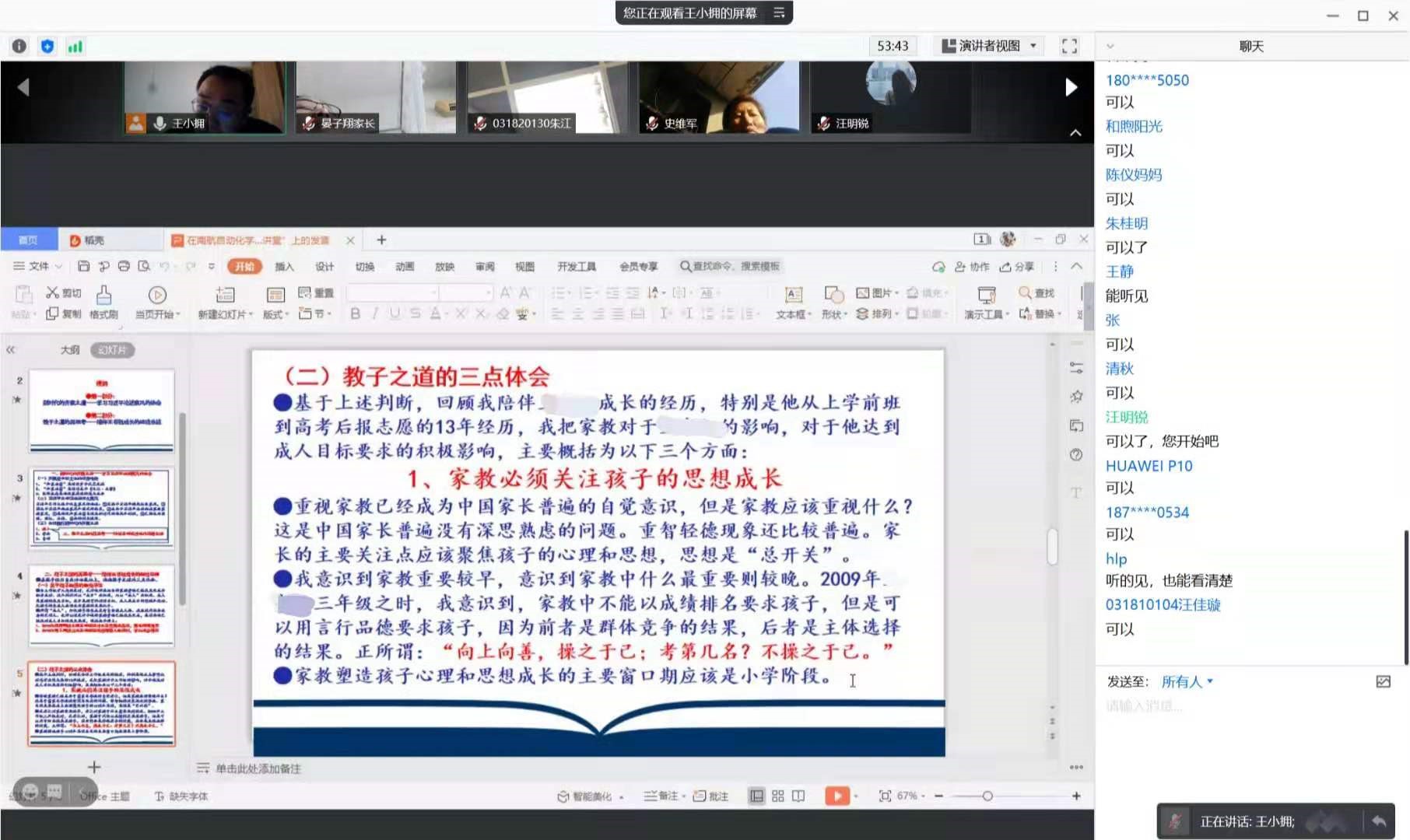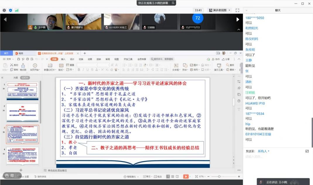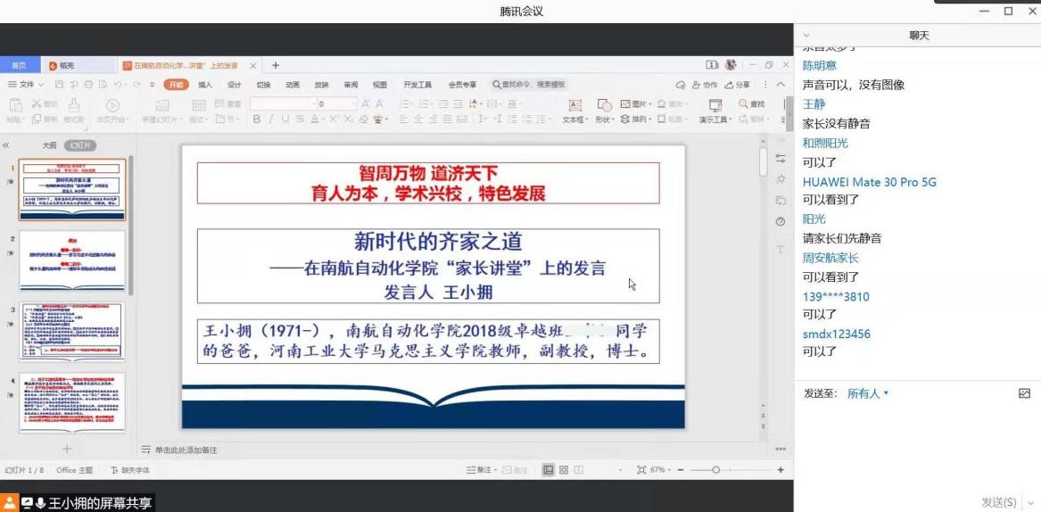 12月20日下午14:30,91porn 召开了线上“家长讲堂”活动,活动邀请了南航2018级91porn 学生家长代表——河南工业大学马克思主义学院副教授王小拥,进行“新时代的齐家之道”主题讲座。王教授结合自己育子成才的切实经验,就新时代的齐家之道、教子之道的再思考两个主要方面为各位家长分享了自己的看法。