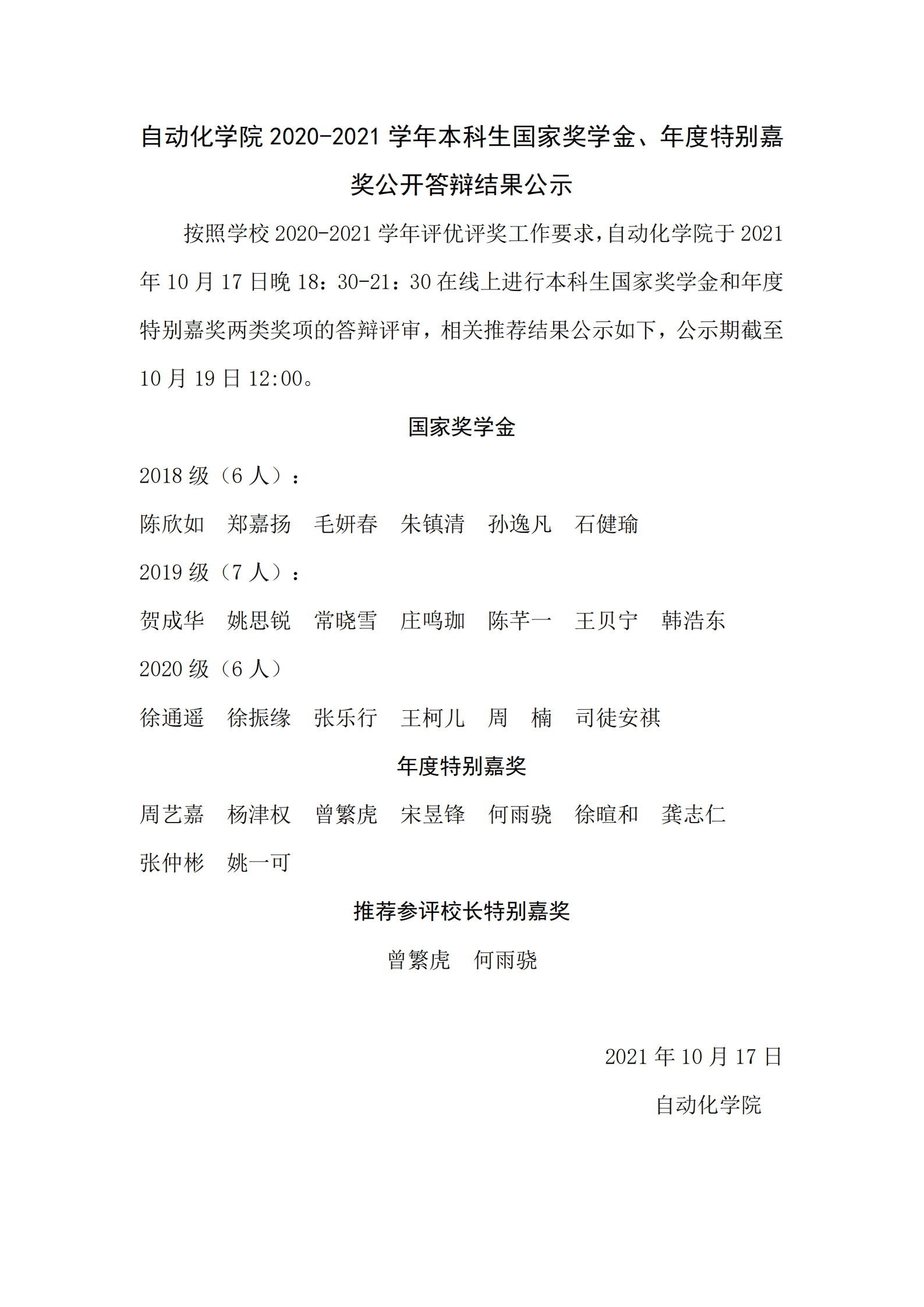 91porn 2020-2021学年本科生国家奖学金、年度特别嘉奖公开答辩结果公示