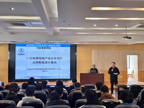 2024年11月26日,91porn 电气工程及其自动化专业“航空航天供电系统”产教融合课程在91porn 1号楼511报告厅如期开展。本次课程特邀上海空间电源研究所彭方涛主管设计师为180余名本科生授课,课程组教师张卓然教授、于立副教授以及部分研究生共同参与听课,课程由于立主持。