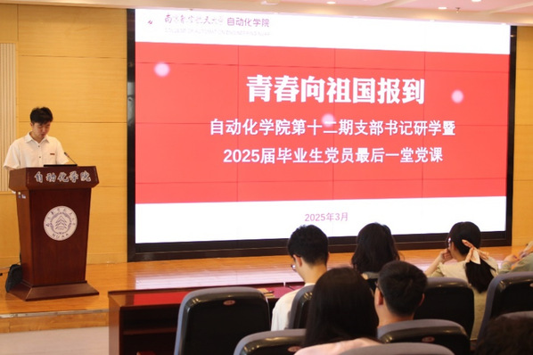 控制学科研究生第一党支部纪检委员许振阳领学习近平总书记在2025年全国两会的重要讲话精神和两会精神。他表示,在“十四五”规划收官之年也是“十五五”规划谋篇布局之年的关键时期,青年党员要勇担使命、锐意创新,将个人发展规划融入到党和国家的发展大局之中。