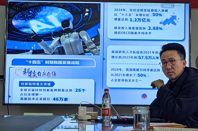 魏佳丹副院长以党的二十届四中全会召开背景为切入点,系统梳理了从“一五”计划到“十四五”规划期间国家发展的历史脉络,强调了坚持党的领导在我国经济社会发展中的根本保障作用。他重点解读了“十五五”时期在我国基本实现社会主义现代化进程中的关键定位,指出这一时期是夯实基础、全面发展的战略阶段,面临机遇与挑战并存的复杂环境,必须保持战略定力,坚定不移推进中国式现代化。