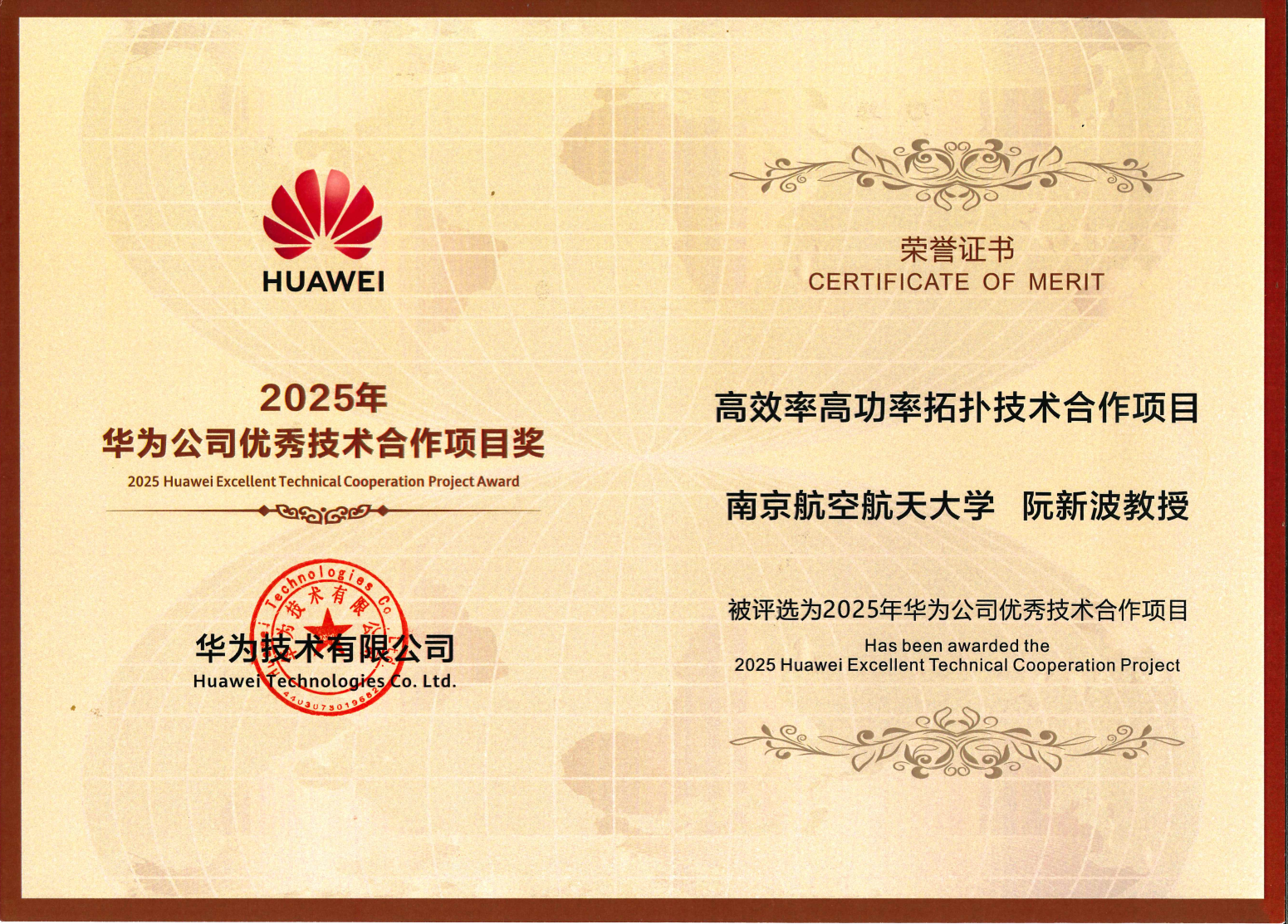 近日, 91porn 阮新波教授团队与华为终端公司的合作项目“高效率高功率拓扑技术”荣获2025年华为公司“优秀技术合作项目奖”。该奖项旨在表彰在技术前沿探索、产业难题攻克及创新成果落地方面取得卓越成效的产学研合作典范。据了解,该奖项有3000多项成果参评,经严格评选,仅评出10项。在颁奖仪式上,华为终端公司相关负责人总结了项目成果,并介绍了成果在华为产品中的落地情况,对阮新波教授团队和南航91porn 给予了高度评价。
