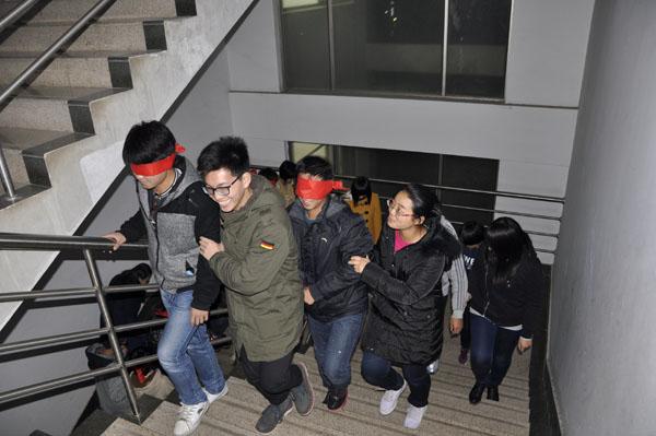 第四环节,与会学员分成两队,一队蒙眼,一队搀扶,在主持人的带领下完成了培养相互信任的小游戏。