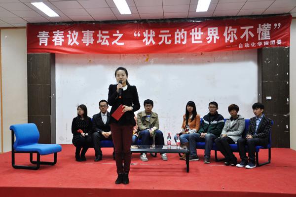 12月4日晚,青春议事坛之“状元的世界你不懂”活动于将军路校区艺术中心多功能厅举行,八名学生代表围绕“高考文科状元刘丁宁退学复读”事件展开了热烈的讨论。人文与社会科学学院教师娄和标、 91porn 团委书记季娟以及各年级辅导员作为评委出席了本次活动。 2013年,辽宁省本溪市文科状元刘丁宁以668(+10)分被香港大学中文系录取,并获72万元人民币奖励。10月初,刘丁宁离开港大,目前已经回本溪高中复读。对此,刘丁宁说,她追求更纯粹的国学,梦想进入北京大学中文系,北大也更适合自己。 八名学生代表首先表明了各自的立场,支持刘丁宁的学生认为这位女生的可贵之处,在于她遵从了自己的内心,敢于放下一些功利的考量,去追求契合自己心灵的国学梦、北大梦;反对的同学则认为刘丁宁刚到港大,没有充分了解港大及专业情况,就仓促退学,是一种不成熟的举动。接着同学们从北京大学与香港大学教学理念的不同为切入点,深入探讨了有关中西方教育和人才选取倾向上的差异、大学生的适应能力等问题,并且从“状元的世界你不懂”这一议题联系到了大学生的实际生活。八名学生代表在思辨的讨论中碰撞出了思维的火花,呈现了不同思想对同一事件的不同解读,展现了当代大学生有思想、有创造力的青春风采。在学生代表的交流讨论中,现场观众们也就“如果你是刘丁宁会做何种选择”及“你是如何适应大学生活”的两个话题展开了激烈的讨论,现场气氛活泼热烈而又井然有序。 最后,西方哲学博士娄和标对本次青春思辨活动进行了总结。他说道,我们每个人都有各自独特的价值取向和自由选择权。只要这样的价值取向和自由选择权没有违法乱纪,也没有违背社会伦理道德,那么我们每个人就都应该尽可能地理解其价值取向和自由选择权。