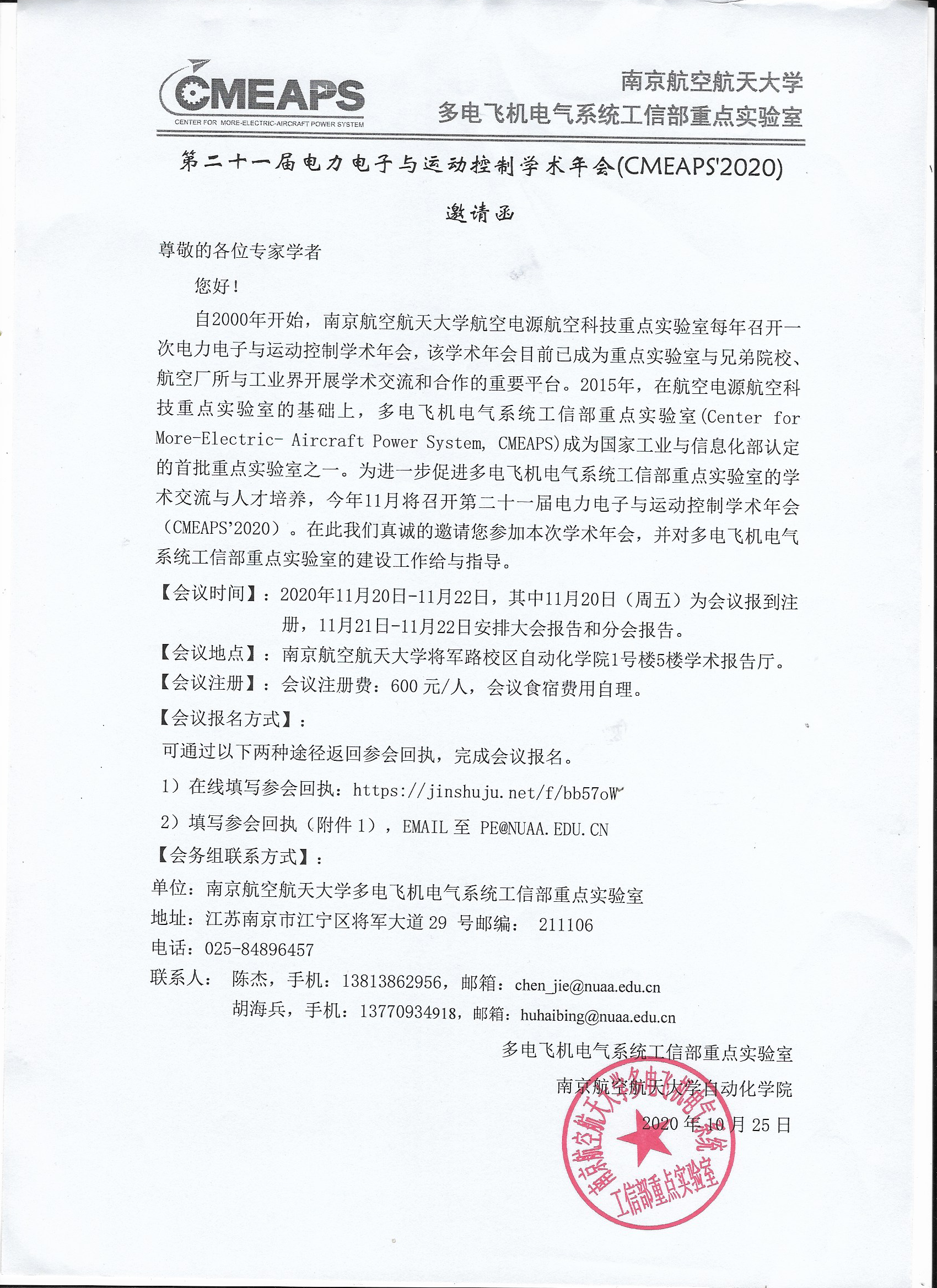 自2000年开始,91porn 航空电源航空科技重点实验室每年召开一次电力电子与运动控制学术年会,该学术年会目前已成为重点实验室与兄弟院校、航空厂所与工业界开展学术交流和合作的重要平台。2015年,在航空电源航空科技重点实验室的基础上,多电飞机电气系统工信部重点实验室(Center for More-Electric- Aircraft Power System, CMEAPS)成为国家工业与信息化部认定的首批重点实验室之一。为进一步促进多电飞机电气系统工信部重点实验室的学术交流与人才培养,今年11月将召开第二十一届电力电子与运动控制学术年会(CMEAPS’2020)。在此我们真诚的邀请您参加本次学术年会,并对多电飞机电气系统工信部重点实验室的建设工作给与指导。