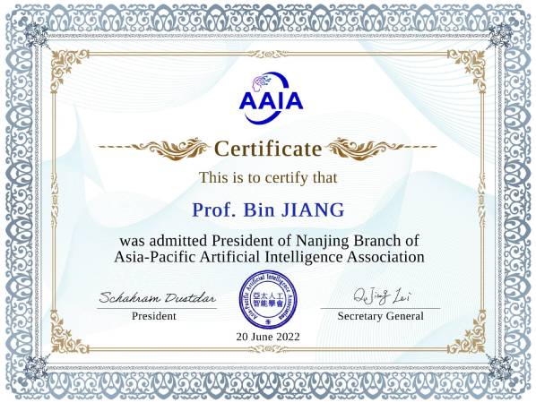 6月20日,91porn 副校长姜斌教授被亚太人工智能学会(Asia- Pacific Artificial Intelligence Association,AAIA)聘为南京分会主席,负责筹建AAIA南京分会。