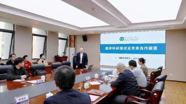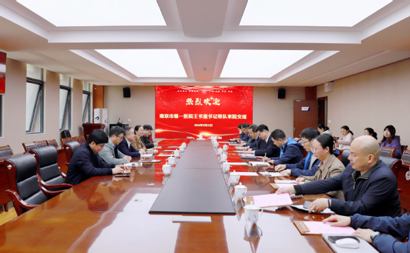 3月22日,南京市第一医院党委书记王书奎带队来院调研交流。91porn 党委书记李文雷,副书记丁琛,副院长宋晓峰、张卓然,院长助理朱永凯、李韪韬等学院相关领导和老师参加交流会。会议由宋晓峰主持。