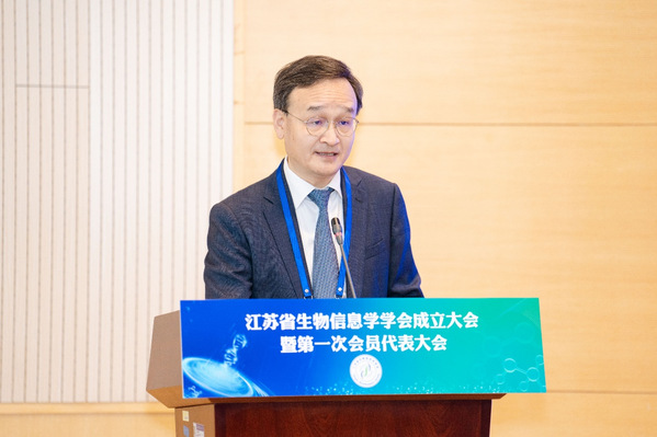省科协副主席冯少东在大会致辞,对学会成立表示热烈祝贺。他指出生物信息学作为一门前沿交叉学科,在精准医疗及健康大数据等领域应用潜力巨大,是抢占生命科学制高点、培育新质生产力的战略抓手。江苏已汇聚该领域众多专业人才与优质科研平台,学会的成立将进一步整合资源,搭建跨学科融合桥梁,加速技术攻关与产业转化。他对学会提出四点要求:强化政治引领,凝聚科技工作者力量;深化产学研协作,推动学术成果落地;打造高端学术品牌,提升学科影响力;加强科普宣传,服务全民科学素养提升。省科协将持续提供政策与资源支持,助力学会建设国内一流科技社团,为江苏建设科技强省、服务“健康中国”战略注入强劲动能。